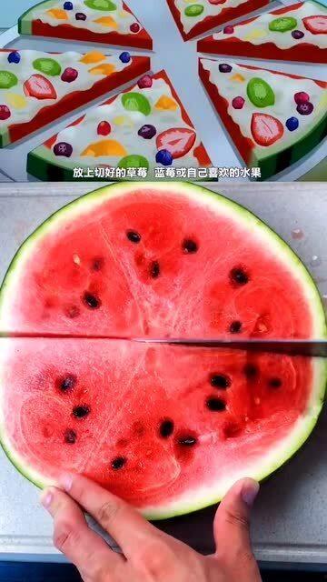 4. 甜品吃法:将西瓜切成小块,与冰淇淋、巧克力酱等甜品搭配,制作成甜品披萨,口感冰凉,甜而不腻。